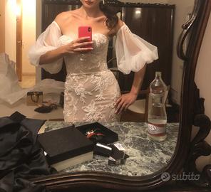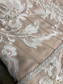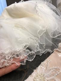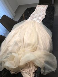 Insieme all’abito cedo dei bellissimi manicotti in tulle decorati e velo di 4 metri con bordo rifinito. L’abito è in ottime condizioni, presenta solo uno strappo ad uno dei veli di tulle provocato da un ramo impigliatosi nella coda del vestito, ma si può rimediare, vale la pena data l’importanza dell’abito.