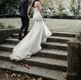 Abito nunziale bicolore nude/bianco, modello sirena, scollo a cuore con coppe. L’abito può vessere indossato con o senza bretelle (sottili, decorate). Nonostante l’aderenza del modello, risulta comodo per via del tessuto leggermente stretch. L’abito è stato prodotto da un atelier su misura, quindi sartoriale, modificabile.