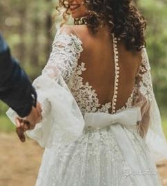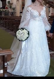 abito da sposa romantico a maniche lunghe, con trasparenze nude. scollo a barca.