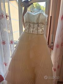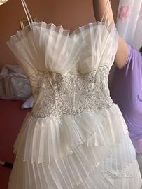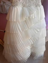 Abito lungo in tulle plissé color bianco avorio. Il corpetto ha una forma a cuore ed è decorato con pizzo floreale, perline e paillettes. Presenta bretelle sottili trasparenti. La parte superiore è strutturata, mentre la gonna è composta da balze plissé sovrapposte, disposte in modo asimmetrico, che creano volume e movimento. Chiusura posteriore con zip (non visibile in foto).