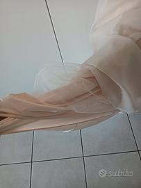 l'abito da sposa è caratterizzato da un corpetto strutturato con drappeggio incrociato sul busto, senza spalline,realizzato in raso opaco( Matteo Satin) nota per la sua finitura elegante e non eccessivamente lucida. l' abito ha la gonna svasata a trapezio con una leggera coda.