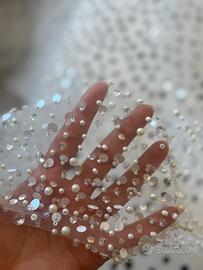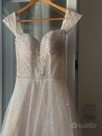 Splendido abito da sposa con corpetto impreziosito da brillantini che donano luce e raffinatezza.