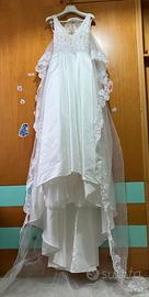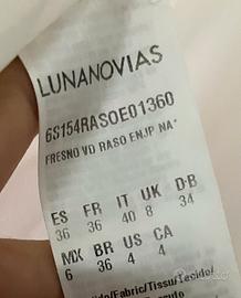 Abito da sposa collezione Lunanovias modello del 2023, comprato l’anno scorso indossato per il mio matrimonio nel settembre 2024. L’abito è in perfette condizioni così come da foto, già lavato e stirato in tintoria e pronto all'uso. Il vestito, stile principessa, presenta un’ampia gonna in Mikado con coda con due comode tasche per mettere un pacco di fazzoletti e il telefono se si vuole. Il corpetto è interamente e finemente ricamato in pizzo e presenta anche dei punti luce che danno maggiore luminosità al vestito senza per questo essere appariscenti. La chiusura è con i bottoni in raso, presenta un bellissimo fiocco che si aggancia con una clip appena visibile dietro il vestito e si chiude una volta chiusi tutti i bottoni. La gonna presenta anche un laccio sotto la coda per metterlo al polso e alzare lo strascico quando ad esempio si fa il ballo degli sposi o per muoversi con un po’ più di agilità. Il velo, acquistato separatamente, lo regalo con l’abito. Anch’esso presenta dei ricami lungo tutto il bordo che richiamano i disegni del corpetto dell’abito. Il velo è lungo 3 m con una vela davanti che arriva sotto il seno. Regalo anche le scarpe che sono un semplice decolletè bianco perlato tacco 10, misura 37. regalo inoltre il velo per il rito della velazio realizzato appositamente dalla sarta per l'occasione. La taglia del vestito è 40 e l’unica modifica che è stata fatta all’abito è stata quella di averlo accorciarlo 4 dita davanti per adattarla alla mia figura. (1,57 cm di altezza con tacco 10).