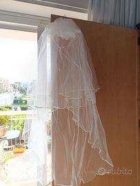 Abito in due pezzi , corpetto e gonnellone con coda, in taffetà di seta, compreso c'è anche sotto gonna con cerchio, corpetto in taffetà di seta e tulle ricamato a mano,scollatura a barca, velo e guanti,il colore dell' abito è avorio rosato e la misura è una M /42 ,no perdi tempo