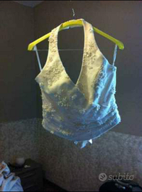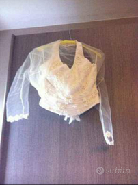 Abito Composto da tre pezzi. Gonna lunga con piccola coda, corpetto con scollatura lavorato con perline e sulla parte posteriore ha un fiore in tessuto, coprispalle velato lavorato alle maniche e al collo. Taglia 42/44. Scarpe n.39, color Avorio, tacco circa 8 cm, con allaccio alla caviglia fatto di strass/Swarovski.