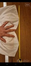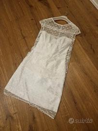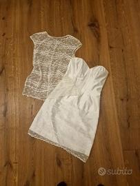 Abito Cymbeline componibile molto rock. Di base è un tubino bianco con corpetto in seta e gonna in pizzo (usabile anche per altre circostanze). Camicetta in pizzo (chiusura dietro con bottoni invisibili). In aggiunta (chiesta da me) c'è una gonna in toulle asimmetrica (corta davanti e lunga dietro), con finitura in raso nero, con fiocco e nastri lunghi che ricadono dietro sulla lunghezza della gonna. Abito fortunato ;) Tg Eu40 (IT44)