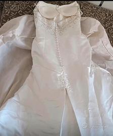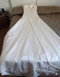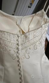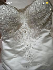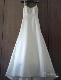 Vendesi splendido abito da sposa color bianco seta/avorio chiaro, caratterizzato da una linea intramontabile ed elegante. L’abito è realizzato in pregiato raso (satin) che dona una lucentezza sobria e una struttura perfetta. Dettagli del design: • Corpetto: Scollo a cuore delicato, interamente lavorato a mano con ricami floreali, perline e punti luce che scendono con un raffinato motivo a "V" sul davanti, slanciando la figura. • Schiena: Caratterizzata da una bellissima fila di bottoncini ricoperti che percorrono tutta la chiusura, aggiungendo un tocco bon-ton e sartoriale. • Gonna: Linea ad A (A-line) con un ampio strascico decorato nella parte centrale e lungo il bordo inferiore con richiami dei ricami del corpetto. • Sostegno: Il corpetto è strutturato con coppe preformate per un fitting impeccabile (come visibile in foto). Dotato di sottili spalline (removibili o nascondibili a seconda delle preferenze). Stato dell’oggetto: L’abito è in ottime condizioni, conservato con cura. La qualità dei ricami e del tessuto lo rendono un capo di alta classe, ideale per chi cerca un look romantico e sofisticato senza tempo. Info utili: • Taglia: 42