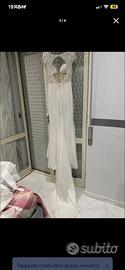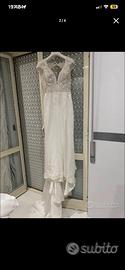 Vendo abito da sposa Mimmagiò con spacco, frange removibili, velo a Madonna con lo stesso ricamo del vestito. Compreso di scarpe nero giardini numero 38, prezzo trattabile.