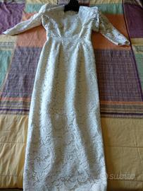 Abito da sposa in pizzo macramè colore avorio fatto in stile tubolare con un piccolo bolerino come coprispalle , realizzato da bottega artigianale specializzata in abiti da sposa. Le misure sono: lunghezza cm137,giro vita cm 90, giro petto cm 90,