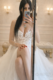 Nuovo vendo per cerimonia non celebrata Brand italiano Corpino con foglie e micro applicazioni Gonna in tulle con spacco Più velo abbinato