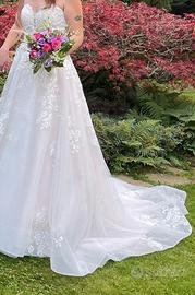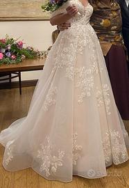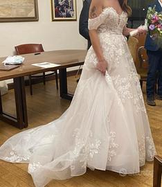Abito da sposa collezione 2024. Unica proprietaria. TG 44. Modifiche apportate solo al seno il resto dell'abito non è stato modificato. Aggiungo anche il sottogonna insieme. Le spalline sono rimovibili tramite bottoncino invisibile.Si spedisce in tutta Italia. Lavato e stirato da professionisti.