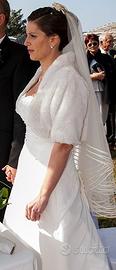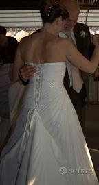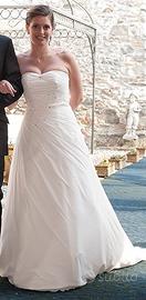 Abito da Sposa Demas Sposi impreziosito con Swarowski nel corpetto e gonna ampia e semplice. Lo strascico si puo accorciare per camminare meglik con un bottone sul retro come da foto.
