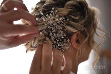 L'accessorio si presenta come un intreccio aereo e ramificato, che ricorda la delicatezza dei rami ghiacciati o dei fiori di campo in inverno. È realizzato con un filo metallico sottilissimo, lavorato a mano per creare una struttura flessibile che si adatta perfettamente alla curvatura dell'acconciatura.