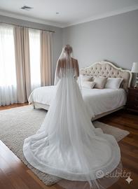 Il velo realizzato in tulle impalpabile e luminoso, scende morbido dalla testa fino a fondersi con lo strascico dell’abito, creando un effetto di assoluta armonia e continuità. La sua trasparenza delicata lascia intravedere il vestito senza nasconderlo, esaltandone la silhouette e il movimento.