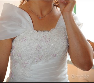 Vendo a malincuore abito di NICOLE. VISTO E PIACIUTO. Taglia 44. Lavato e tenuto nella sua sacca originale. Abito bellissimo per chi ama i vestiti principeschi. Perlinato bianco e quelli lilla fatti aggiungere sia in alto sul decoltè che anche in basso. Ha anche un fiore (fatto fare) sul fianco sempre in bianco avorio e lilla. In più coprispalle che si può anche staccare. (vedi tutto nelle foto).