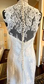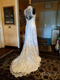 Abito da sposa di sartoria, nuovo di campionario (mai indossato) in pizzo chantilly, struttura in raso di seta, taglia 42/44, seno 92 cm, vita 74 cm, fianchi 96 cm, lunghezza frontale 148/150 cm, con rouche in strascico, da stirare.