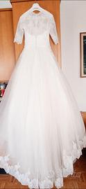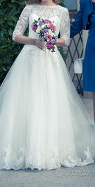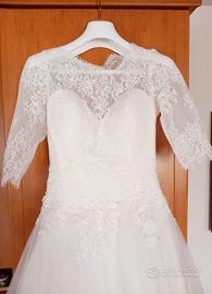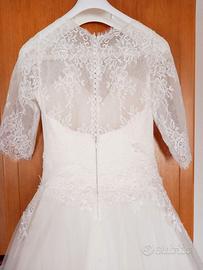 Abito da sposa della marca Divina sposa. Gonna in chiffon, corpetto con intreccio ad uncinetto, scollo a barca e manica a 3/4 quarti, chiusura del corpetto dietro con bottoni. Taglia 40, sono disponibile in privato per fornire tutte le misure su richiesta