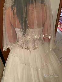 Vendo Abito da sposa tg 42-44 in pura seta con corpetto in pizzo francese, cintura in seta diamantata completo di velo con diamantini, guanti e coprispalle pagato 3500 ? (dimostrabile con fattura)