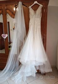 meraviglioso abito da sposa, con strascico e velo di 3 metri, il tutto realizzato con strass e perline
