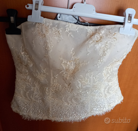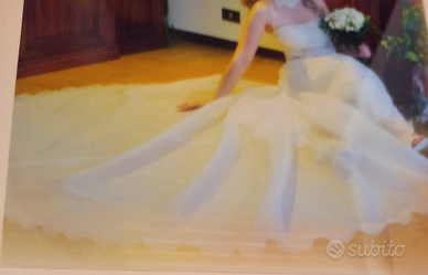 Formato.da un top impreziosito da paillettes e lustrini e 3 gonne una in raso al ginochio come sottoveste l altra in tessuto e la terza in tulle con lungo strascico come da foto più c'è il cuscinetto porta fede un velo da attaccare ai capelli con pettenessa e collo all 'americana staccabile.avrei altre foto da pubblicare ma il massimo è 6 se c'è qualcuna interessata posso inviarle a parte