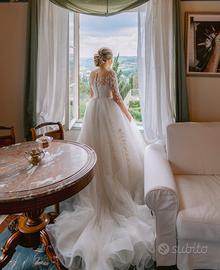 Abito da sposa elegante con velo lungo Splendido abito da sposa in stile romantico ed elegante, perfetto per un giorno indimenticabile đ¤ Realizzato con tessuto leggero e raffinato, presenta un corpetto con delicati dettagli in pizzo e maniche trasparenti ricamate. La gonna ampia e fluida crea un effetto principesco, accompagnata da un lungo strascico che dona un tocco scenografico. Incluso velo lungo coordinato, leggero e decorato, che completa perfettamente il look. ⨠VestibilitĂ femminile ed elegante ⨠Ideale per cerimonie classiche e romantiche ⨠Condizioni: Indossato una sola volta, in condizioni eccellenti. Taglia: EU 38 / IT 42 (veste come S-M)