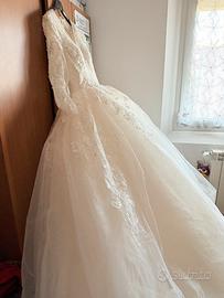 Modello stile principessa con gonna ampia in tulle e raffinati ricami in pizzo. Maniche lunghe, molto romantico ed elegante. Colore avorio. Taglia: IT 46–48 (circa XL), adatto per 60–65 kg. ✔ Schiena regolabile (si adatta facilmente a diverse misure) ✔ Facile da modificare ✔ Condizioni perfette, conservato con cura Ideale per matrimonio in chiesa o stile classico. Prezzo: €400 (trattabile) Possibilità di prova / ritiro a Bazzano (Bo)/Savignano Sul Panaro (Mo)