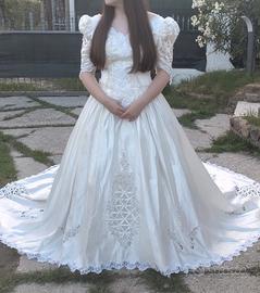 Abito da sposa taglia 44/46 colore avorio stile principesco, con lavorazioni eleganti e raffinate, coda lunga e tutta lavorata con ricami, strass e perline che richiamano lo stesso ricamo dell'abito. Viene ceduto insieme all'abito anche il cerchio fatto di toul, il velo è lungo quanto la coda dell'abito e ha il doppio velo un po' più corto sul davanti, il velo lo regalo. Ritiro a carico dell'acquirente.