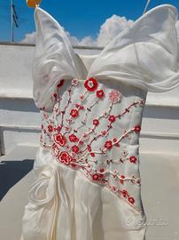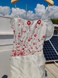 Abito da sposa Emé di Emé tg42 colore avorio in seta e tulle il corpetto è ricamato con strass bianchi e rossi. Le spalline sono removibili. Il prezzo è trattabile.