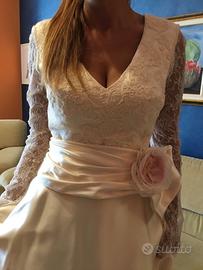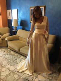 Vendesi questo abito unico cucito su modello valentino spose a mano. Realizzato con stoffe pregiate di seta pura e pizzo originale. Il modello va bene per una sposa di altezza 1.70-1.75 corporatura media, misura 46. L’abito e’ corredato come si vede dalle foto da una cintura staccabile con fiore e una cuffia retro per la testa. La parte superiore dell’abito si chiude con una serie di piccoli bottoni. A chi lo acquistera’ regalo una stola sempre in pizzo, la cuffia e la custodia dell’abito stesso. La qualita’ delle stoffe e della fattura dell’abito ti sorprendera’. Se acquisti entro luglio 2025 applicherò uno sconto.