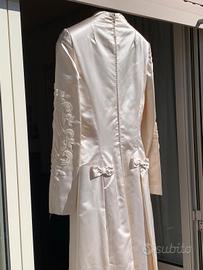 si tratta di un abito da sposa in raso color panna fatto su misura dalla sartoria Pieralisi. Ha maniche lunghe con un prezioso ricamo fatto a mano.