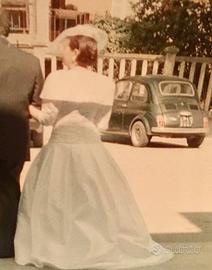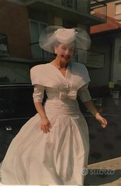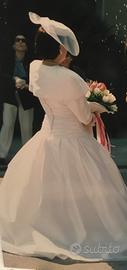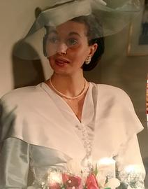 Abito da sposa firmato Delsa in taffetá di seta e addirittura con fodera in viscosa, ossia non ha nulla di sintetico. Stile retrò (inizi del ‘900). Completo di sottogonna, delizio e cappello /veletta, guanti e fermaglio per capelli. Usato soltanto 3 ore, mai macchiato e portato comunque in lavanderia a rinfrescare. Taglia 44.