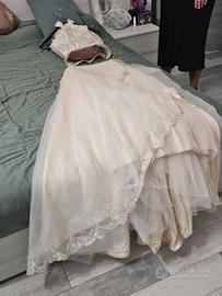abito da sposa usato, taglia 42/44, color cipria, pizzo/organza, cerchio sottogonna, scollo all'americana, scarpe in raso abbinate n. 39. Marca Sposissime di Maison Marriage, anno 2005