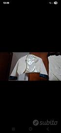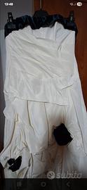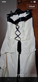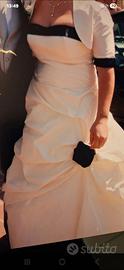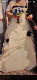 Vendo abito da sposa, usato UNA volta sola naturalmente colore avorio con finiture in seta blu: rose blu a destra e sinistra giro petto a cuore in raso blu ,chiusura con cerniera e lacci blu dietro tipo corsetto, coprispalle corto sempre avorio con giro braccio blu. Compreso di custodia x abito. Io pesavo 68 kg quando l'ho usato.volendo con 30 euro ho anche i sandali blu con tacco numero 38