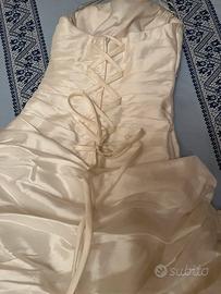 Abito da sposa usato, taglia 42. Non ci sono macchie né strappi. Nella parte interna dell'abito ci sono segni verdi, di erba (non lavato). Colore bianco. Compreso anche velo molto lungo.