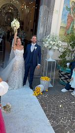 L’Atelier Celebrity Napoli ha aggiunto un gonnellone rimovibile per trasformare l’abito in una versione da principessa e un velo siciliano per avvolgere di fiori anche il resto del corpo.