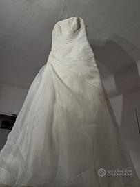 ✨ Abito da sposa Pronovias – Modello Uxue (Collezione 2013) Splendido abito da sposa originale Pronovias, modello Uxue, elegante e senza tempo. Corpetto ricamato con delicati dettagli luminosi, chiusura a corsetto e gonna ampia con drappeggio laterale che valorizza la figura. 📌 Caratteristiche: Marca: Pronovias Modello: Uxue – 2013 Corpetto senza spalline, ricamato Taglia 44 Drappeggio laterale che snellisce e slancia Schiena con chiusura a corsetto Gonna lunga con coda elegante Sul retro è presente un nastro blu scuro, sostituibile con qualsiasi colore Indossato una sola volta, poi lavato in lavanderia professionale Conservato nella sua custodia