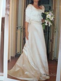Abito da sposa in perfette condizioni,lavato e riposto con cura.Taglia 46 composto da due pezzi,corpetto con chiusura a corsetto sulla schiena. Raso colore avorio con ricami e perline. Molto elegante, possibilità di diminuire o aumentare di una taglia grazie alla chiusura a corsetto.Ideale per mezze stagioni inverno.