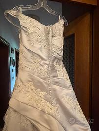 Abito da sposa grigio perla in raso di seta con applicazioni in pizzo bianco e cristalli. Arriciatura su un fianco e leggero strascico. Linea ad A, scollo a barca e chiusura sul retro con zip ricoperta da piccoli bottoncini. Taglia 40 che veste anche una 42. Regalo il velo in tulle, coprispalle, guanti, cuscinetto fedi e camicia uomo Pignatelli collo 43 dello stesso tessuto e colore.