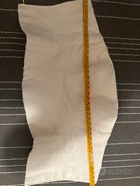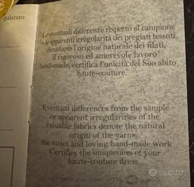 Abito con gonna e corpetto in pura seta. Gonna rifinita con velo in organza. Colore avorio. Completa l’insieme una camicia in organza con polsini in seta, non necessaria ma utile per la chiesa. Abito fatto a mano, veste una taglia 40. Altezza 170cm, giro vita 69 cm, taglia seno seconda. Lavato, non stirato.