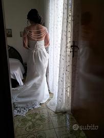 Abito da sposa in Mikado bianco seta a sirena con scollo a cuore, retro impreziosito da una fila perline che nascondono la cerniera, codata in pizzo con maxi fiocco. La collana in perle è esclusa dalla vendita.