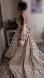 Rivendo a prezzo esiguo perché presenta due macchie sul fondo della gonna, una scucitura sull'orlo dello strascico e un bottone con copertura da riprendere o sostituire.