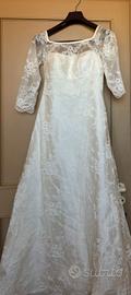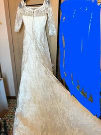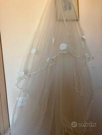 Vendo abito da sposa in pizzo, comprato in atelier napoletano, nuovo, lavato in lavanderia. Tutto pizzo con fiori , modello sirena con scollo tipo barca e coda con manica a tre quarti (taglia 44 circa, misura vita 70 e seno 75 ) con involucro e velo con fiori ricamati[ uguali all abito] di circa 3 m, infine guanti in velo e cuscinetto per le fedi prezzo 1000 euro (pagato 4500) citta Milano.