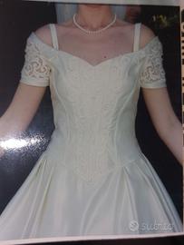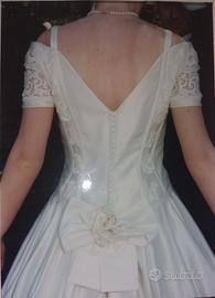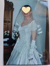 Abito da sposa unico, da sartoria, in raso e pizzo, bellissimo tessuto morbido e piacevole al tatto, gonna ampia con strascico minimo, pizzo cucito a mano, taglia circa M-L, per donna alta circa cm 170/175 e che pesa circa tra 55/68 kg. Elegante scollo a V sul retro fino a metà schiena. Compresi nel prezzo avrai il velo e la sottogonna in tulle, regolabile in vita.