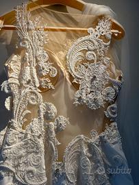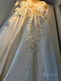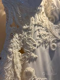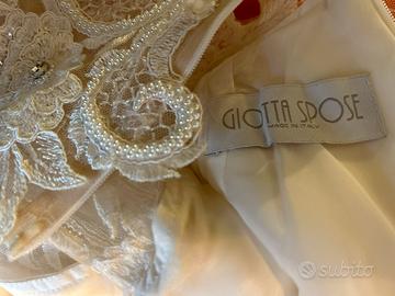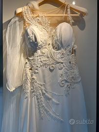 Si vende abito da sposa, bianco, completamente in seta e ricoperto di swaroski. Taglia M/S Strascico corto e velo lungo, cuscinetto portanelli incluso. Marca Giotta Spose