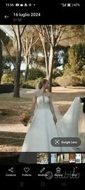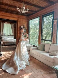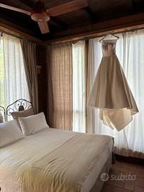 Usato poche ore e sostituito da altro abito. Lavato e stirato in tintoria, completo di velo lungo e sottogonna.