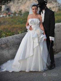 Meraviglioso abito da sposa in mikado e cady di seta, tg 44, Renato Savi Roma Made in Italy collezione 2014. Sul corpetto pizzo francese con Swarovski e perline. Vita 68 cm. Coda di tulle estraibile e fiocco rigido estraibile con cascata di fiori di seta. Sottogonna in crinolina. Pagato 5.500€. Matrimonio andato in onda su Real Time con Wedding planner Enzo Miccio. ALTISSIMA QUALITÀ E PREZIOSITÀ. Tenuto perfettamente. Scollo a V sulla schiena e spalla scoperte.