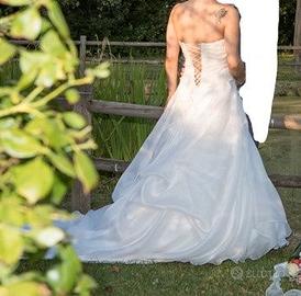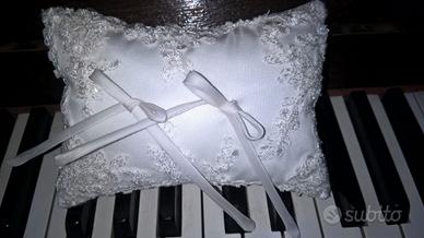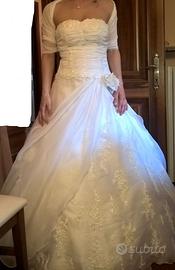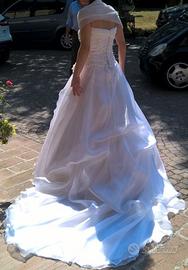 Vendo abito da sposa in ottimo stato, nuovo usato ovviamente solo una volta. Lavato e stirato in lavanderia e perfettamente conservato nell'apposito sacco. E' fatto completamente a mano artigianalmente da una sarta specializzata e curato nei minimi dettagli. E' in pura seta italiana al 100% e è composto da 20 metri di seta, è creato su misura per una taglia 42 con un’altezza di circa 1.65 dipende anche dalle scarpe. Essendo realizzato a mano si possono fare delle modifiche e può essere adattato. Ha una coda non eccessivamente lunga ma morbida che forma onde soffici, il corpetto che è scollato a cuore è senza spalline ed arricciato, sia quest'ultimo che la parte davanti dell'abito è tutta ricamata a mano. La chiusura dietro è del tipico corsetto tutta intrecciata. Completo di cuscino per le fedi fatto dello stesso materiale e ricami. E’ possibile provarlo presso la sarta che lo ha realizzato e nel caso può apportare le modifiche necessarie. Per qualsiasi informazione contattare. Se realmente interessate è possibile provarlo. Il prezzo è trattabile.