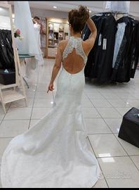 Perfette condizioni, usato il giorno del matrimonio e già lavato. Con custodia. Tessuto Mikado. Corpetto con scollatura all'americana con strass e perline che si prolungano a triangolo lungo tutta la parte posteriore della coda. Nella parte anteriore il ricamo termina all'altezza dei fianchi. Pagato in atelier Euro 1300 Possibile prova
