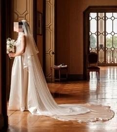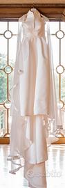 Abito sposa Jesus Peiro in raso Duchesse bianco del settembre 2025, completo di velo lungo con veletta e cappa posteriore staccabile.Taglia 44.