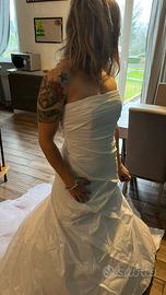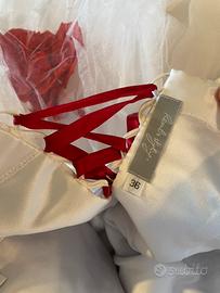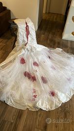 Anno 2010 ma ancora in ottime condizioni. Tenuto sempre in due sacchetti sottovuoto . Seta e tulle . Da lavare e stirare (ha piccoli segni neri nel bordo che struscia nel pavimento). Fiori rossi in seta , cuciti singolarmente.
